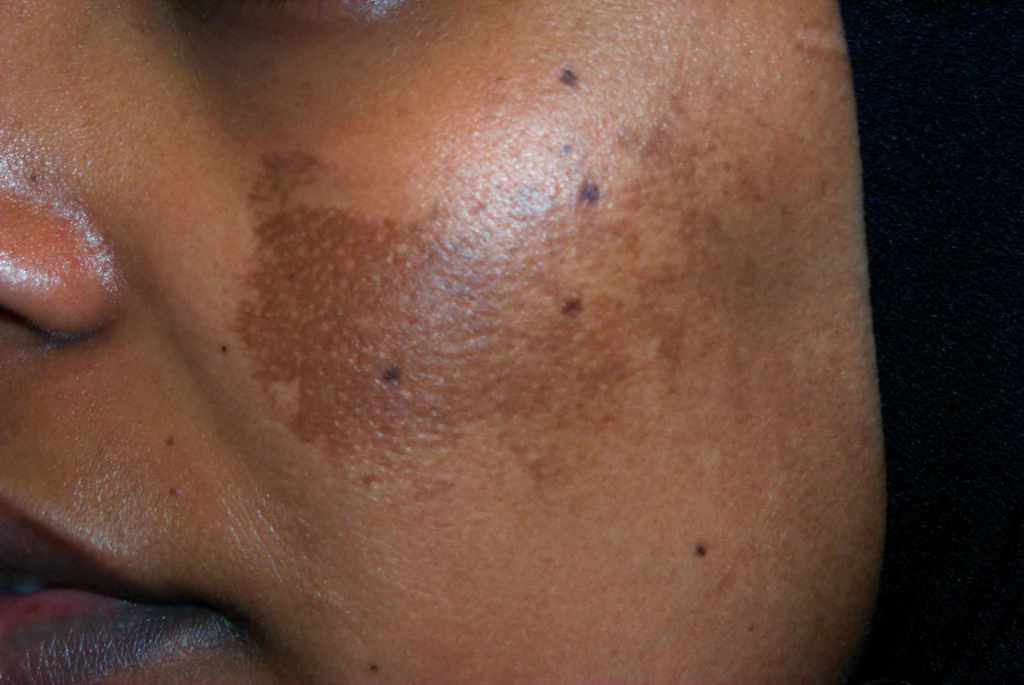 - Melasma: normally tied to hormonal changes, especially during pregnancy, it’s often called “mask of pregnancy” and can worsening by sun exposure or with the using of hormonal contraceptives. It characterized by a brown or blue-grey patches or freckle-like spots.